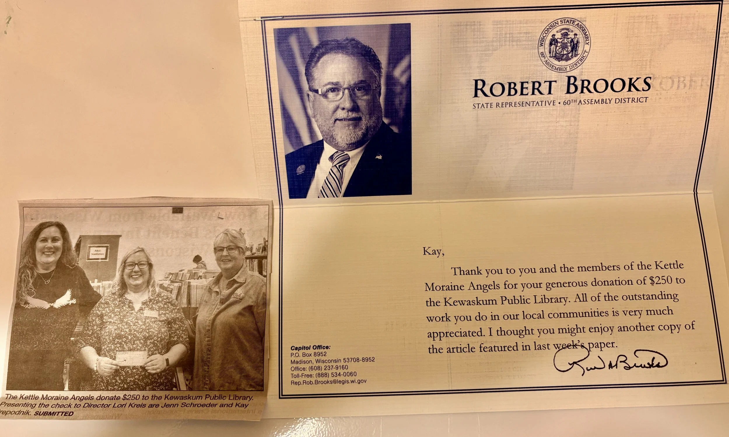 The Kettle Moraine Angels were recognized by Robert Brooks, the State Representative (Fond du Lac) area for our donation to the Kewaskum Library Foundation. We hope it helps with their new location. Jenn and Kay presented the check.